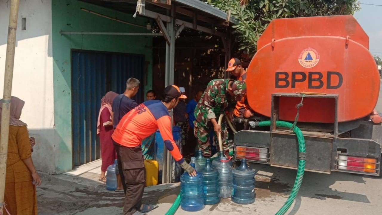 Untuk mengatasi kesulitan masyarakat terkait pasokan air bersih, Prajurit TNI AD dari Koramil 0602-06/Kasemen terus membantu Badan Penanggulangan Bencana Daerah (BPBD) Kota Serang, menyalurkan bantuan air bersih kepada masyarakat yang terdampak kekeringan akibat kemarau, bertempat di Kampung Kebasiran Kelurahan Sawah Luhur Kecamatan Kasemen Kota Serang Provinsi Banten, Kamis (28/09/2023).