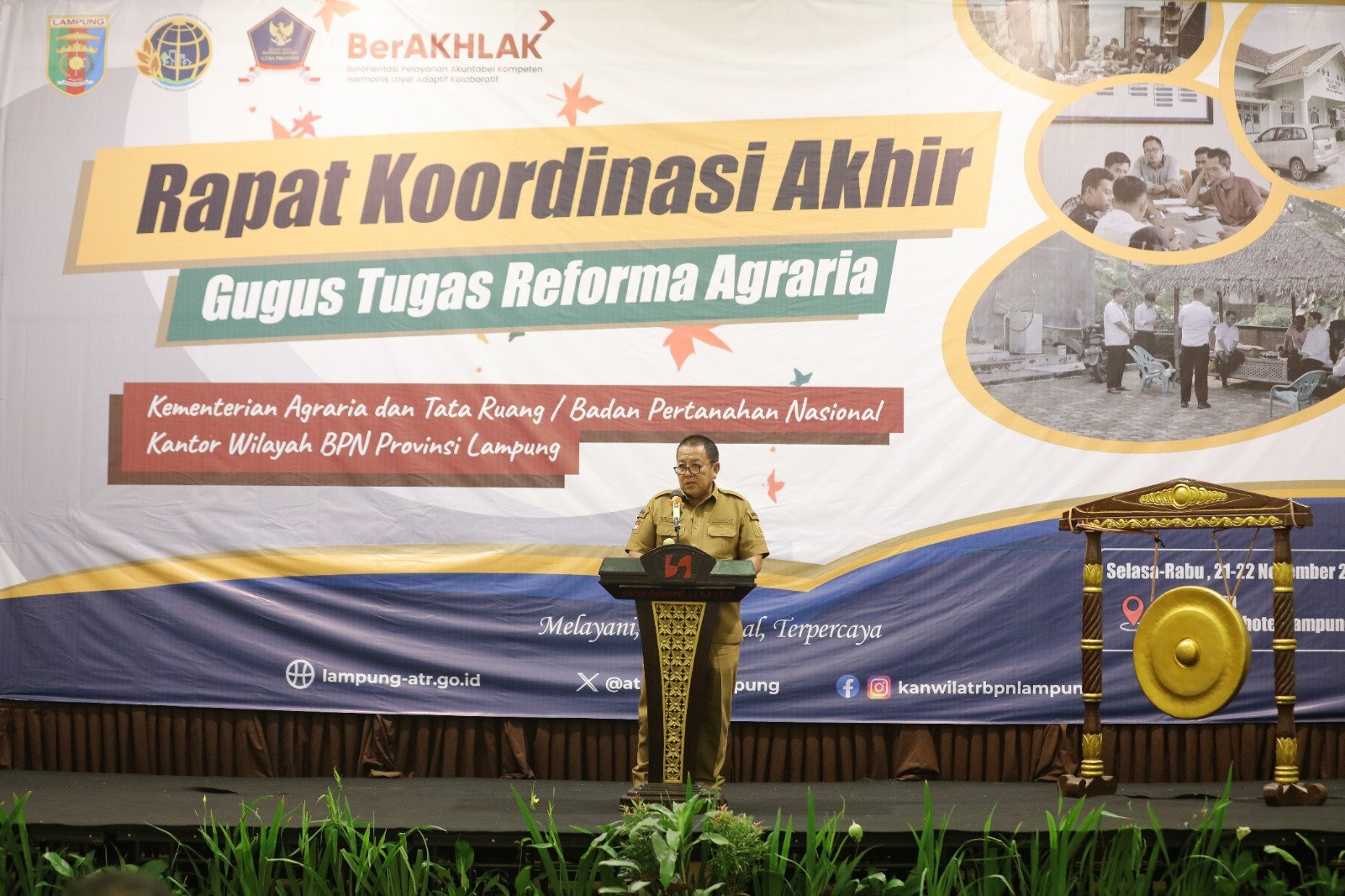 Rapat Koordinasi Akhir Gugus Tugas Reforma Agraria Provinsi Lampung ini mengangkat tema Sinergitas Lintas Sektor Dalam Rangka Pelaksanaan Reforma Agraria untuk Mendukung Pertumbuhan Ekonomi dan Kesejahteraan Masyarakat.