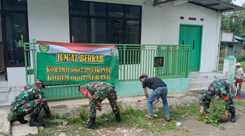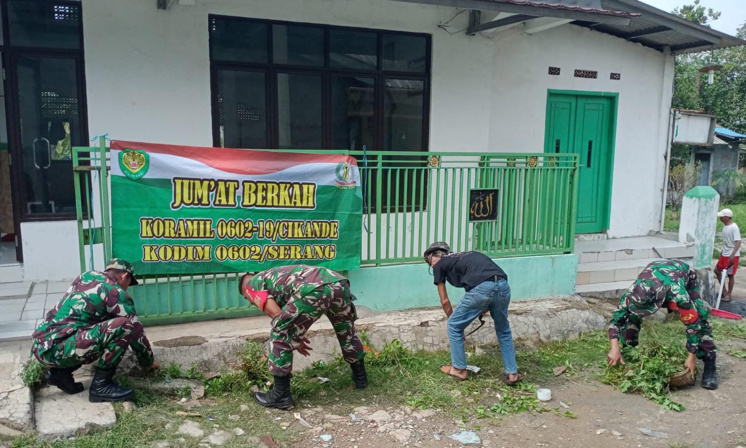 BANTEN.GERBANGPATRIOT.COM – Serang, Sebagai bentuk kepedulian terhadap sarana tempat ibadah, melalui program Jum’at bersih. Koramil 0602-19/Cikande Kodim 0602/Serang melaksanakan kegiatan, Karya Bakti (Karbak) pembersihan lingkungan Mushola Baiturohman bersama warga, bertempat di Kampung Masigit Desa Situterate, Kecamatan Cikande Kabupaten Serang Provinsi Banten, Jum’at (24/11/2023).