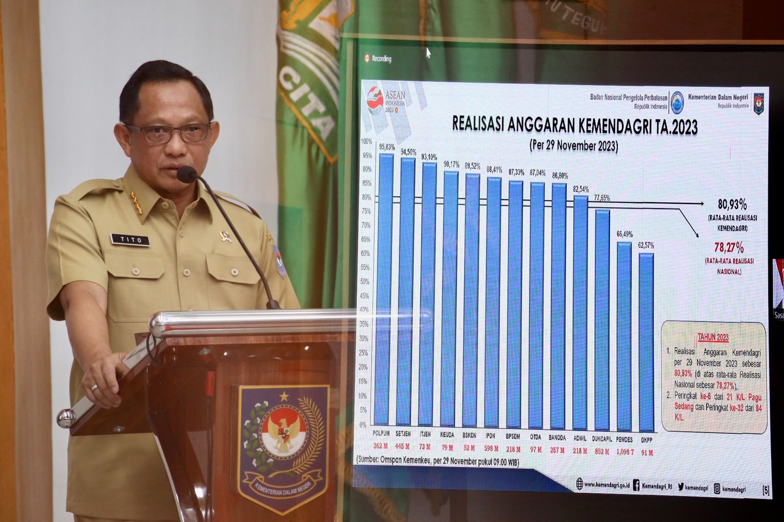 Dalam sambutannya, Mendagri menjelaskan, pada TA 2024 Kemendagri mendapatkan alokasi anggaran sebanyak Rp3,35 triliun. Anggaran ini mengalami kenaikan sebesar 0,81 persen dibandingkan tahun sebelumnya. Sedangkan BNPP mendapatkan alokasi anggaran sebanyak Rp232,57 miliar. Angka ini juga meningkat sebesar 0,54 persen dibandingkan tahun sebelumnya.