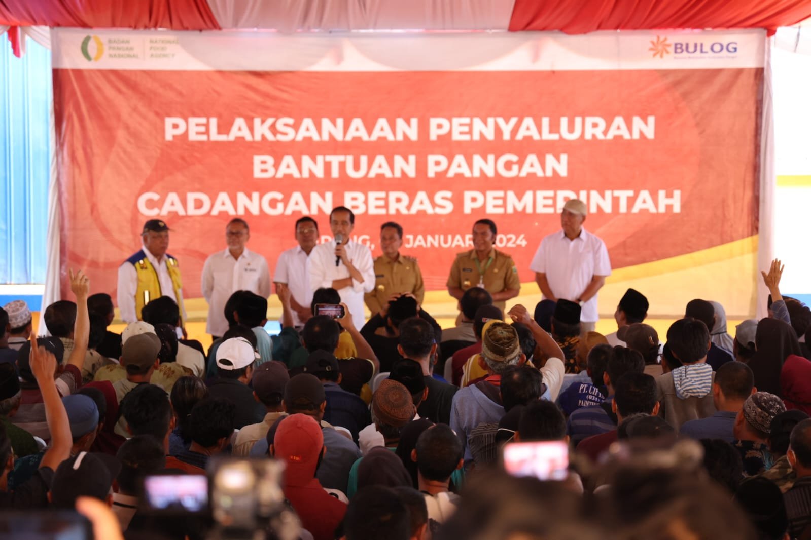 BANTEN.GERBANGPATRIOT.COM – Serang, Penjabat (Pj) Gubernur Banten Al Muktabar mendampingi Presiden RI Joko Widodo tinjau Gudang Beras Bulog (GBB) Umbul Tengah Sub Divre Serang di Jl Raya Cilegon Km. 3,5 Drangong, Kota Serang, Senin, (08/01/2024). Presiden Jokowi juga melakukan penyerahan bantuan pangan Cadangan Beras Pemerintah (CBP) kepada masyarakat Keluarga Penerima Manfaat (KPM) di Kota Serang.