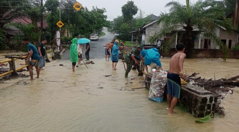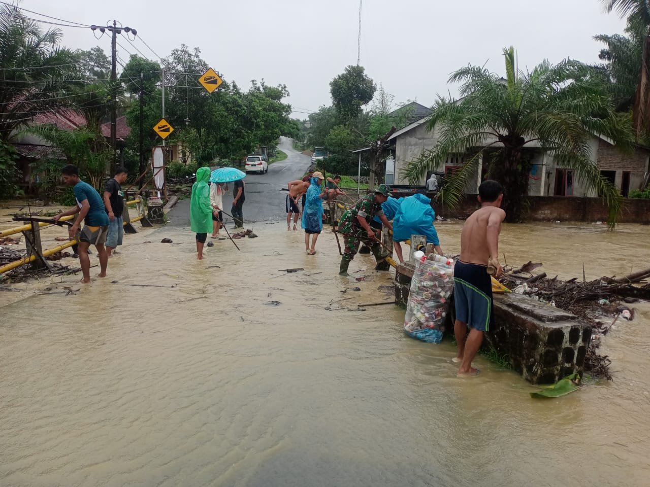 Koramil 0116/Cikeusik yang dipimpin langsung Danramil Kapten Inf. Mualif berinisiatif segera mengajak warga sekitar untuk melakukan pembersihan sampah yang menyumbat di bawah jembatan agar aliran bisa mengalir dan tidak meluap ke perkampungan dan jalan raya.